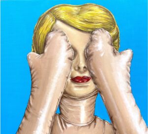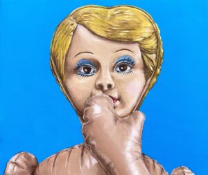 Within this structure, Judy becomes the perfected ideal of manufactured womanhood: hollow, inflatable, compliant, and replaceable. She embodies the paradox assigned to women across time. Be pure, yet available. Be moral, yet sexual. Be sacred, yet disposable. The triptych stages these contradictions not through subtle metaphor but through exaggerated moral theater.